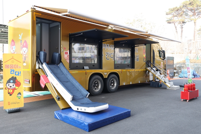 [충북일보] 세종시교육청안전체험교육원(이하 교육원)이 11일 바른초등학교에서 제작을 마친 신규 안전행복버스 시연회를 개최했다.교육원은 이번에 제작된 안전행복버스의 명칭을 '안전행복교실'로 정했으며, 최신 기술을 적용해 다양한 재난 상황을 체험할 수 있도록 설계했다고 밝혔다.